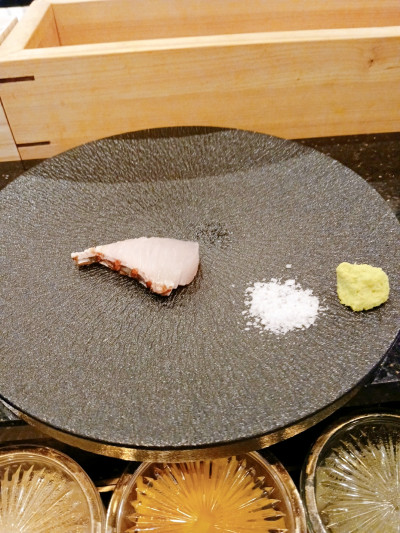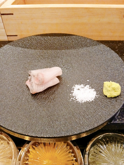 간단히 위를 달래고 있는 사이에 앞에 놓인 큰 접시 위에 소금과 고추냉이를 올려주시고 이제 회를 코스별로 올려 주십니다. 소금과 고추냉이는 이곳에서는 다 먹는다면 추가로 요청하셔도 무료로 제공이 됩니다.