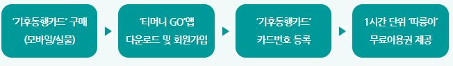 | 따릉이 (자전거) | '티머니 GO' 앱을 통해서 기후동행카드번호 등록 시 기후동행카드 사용기한 내 따릉이 1시간 이용권 제공됩니다. 실물카드는 '티머니카드&페이 홈페이지' 에 등록된 카드에 한하여 따릉이 무료이용권 생성이 가능합니다. |