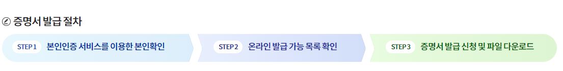 그럼 증명서 발급 절차에 대한 그림 페이지가 확인됩니다. 위에서 이야기드린 본인인증서가 이곳에 사용되는데, 총방법은 2가지 방법이 있습니다. '간편 인증' 방법과 '공동인증서'로 나눠지게 됩니다.