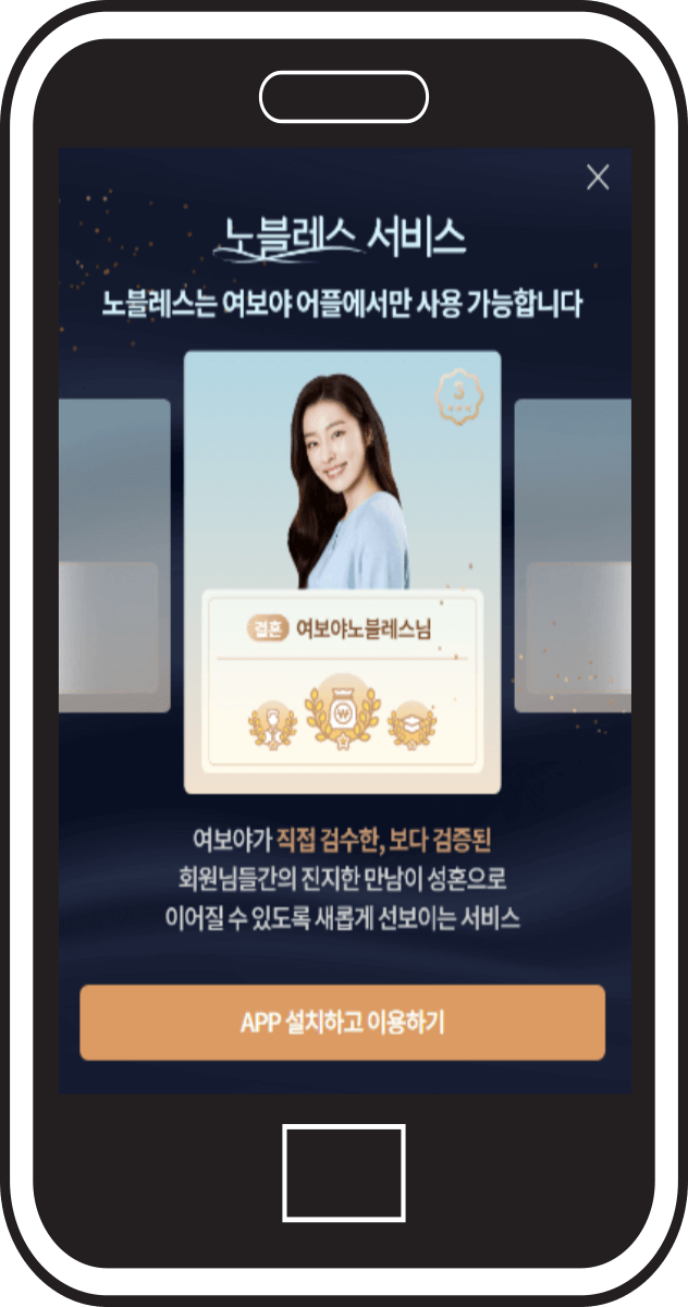 여보야에서 직접 검수해서 나온 검증된 회원들 간의 매치할 수 있도록 도와주는 노블레스 서비스가 있습니다.