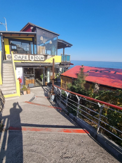 강구항을 지나서 영덕해맞이공원을 내비게이션 도착으로 설정하고 가다 보면 카페봄 (CAFE BOM)이라는 우측에 있습니다. 바다를 바라보고 있으며, 바로 돌 위에 지어진 카페라 보실 수 있습니다. 혼자서 생각할 일이 있고, 동해 바다가 보고 싶어서 오게 되었는데 이런 곳이 있다는 걸 처음 알게 되었습니다. 길가에 있는 위치라서 주차공간이 대략 4~5 공간 밖에 없다 보니 쉽게 지나칠 수 있다는 단점이 있습니다.