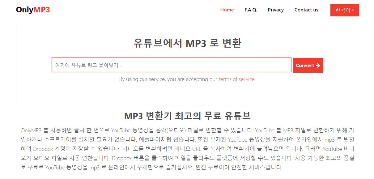 두 번째 알려드릴 사이트는 OnlyMP3 사이트입니다. 이곳도 역시 회원가입 절차가 필요 없으며 해당 사이트 통해서 유튜브 음원추출이 가능한 곳 중 하나입니다.