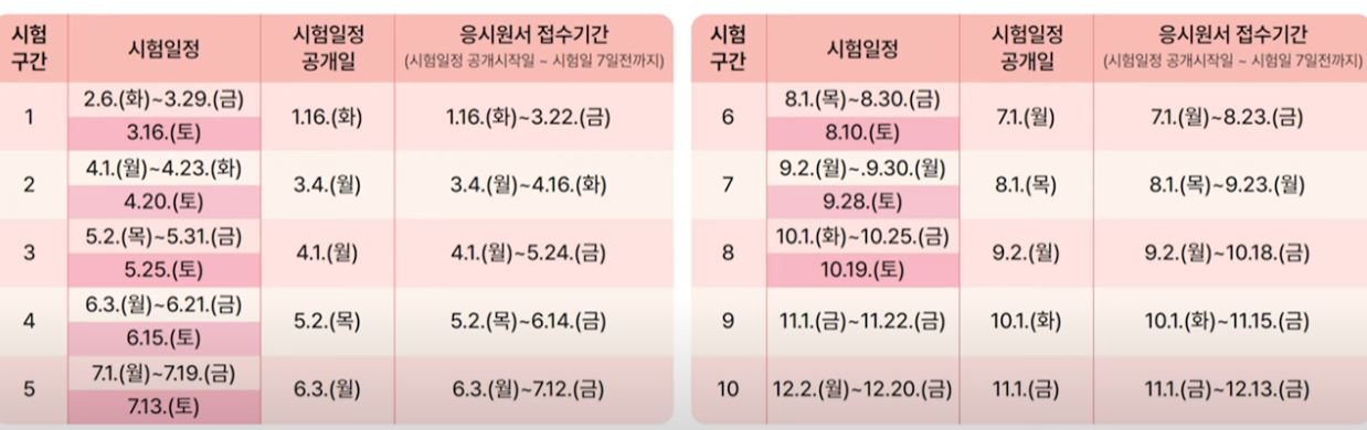 - 시험센터에 따라 시험일과 시험시간(오전/오후)이 다르게 운영될 수 있으므로, 해당 내용은 구간별 '시험일정 공개일'에 다시 한번 확인하시기 바랍니다.