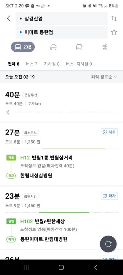 목적지로 검색을 하니깐 8 구역에 대한 정보를 위에 사진처럼 알려줍니다. 나온 정보에서 내가 가장 쉽고 빨리 갈 수 있는 경로를 선택할 수 있으며, 처음 오는 장소라 할지라도 한눈에 쉽게 알려주는 경로를 따라 쉽게 대중교통을 이용할 수가 있습니다. 내가 서 있는 장소가 버스 타는 곳이 아니라면 도보를 통해 가장 가까운 정류장까지 안내를 해주기 때문에 길을 헤매실 필요가 없습니다. 대중교통을 거의 이용하지 않고 집에 있는 자가용으로 이용하는 저에게는 버스 번호가 너무나 생소합니다. 하지만 이 앱을 사용하게 되면, 차 번호까지 정거장 출발 시점부터 알려 주게 되니 벽에 붙어 있는 버스 번호 구역 보며 안절부절못할 이유가 없어졌습니다.